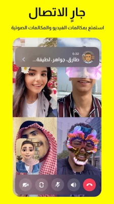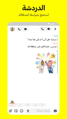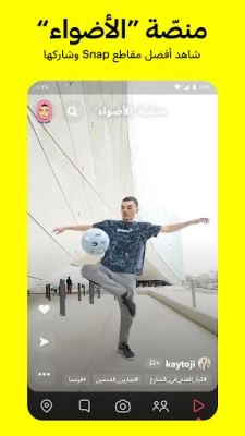 اطّلع على القصص المعروضة في مجتمع Snapchat، والتي تستند إلى اهتماماتك. • اكتشف الأخبار العاجلة والعروض الأصلية الحصرية. منصّة "الأضواء" • تعرض منصّة "الأضواء" أفضل ما يقدّمه Snapchat. • أرسِل مقاطع Snap الخاصة بك أو اجلس واسترخِ وشاهِد المحتوى. • اختر المقاطع المفضلة لديك وشاركها مع أصدقائك. الخريطة •
